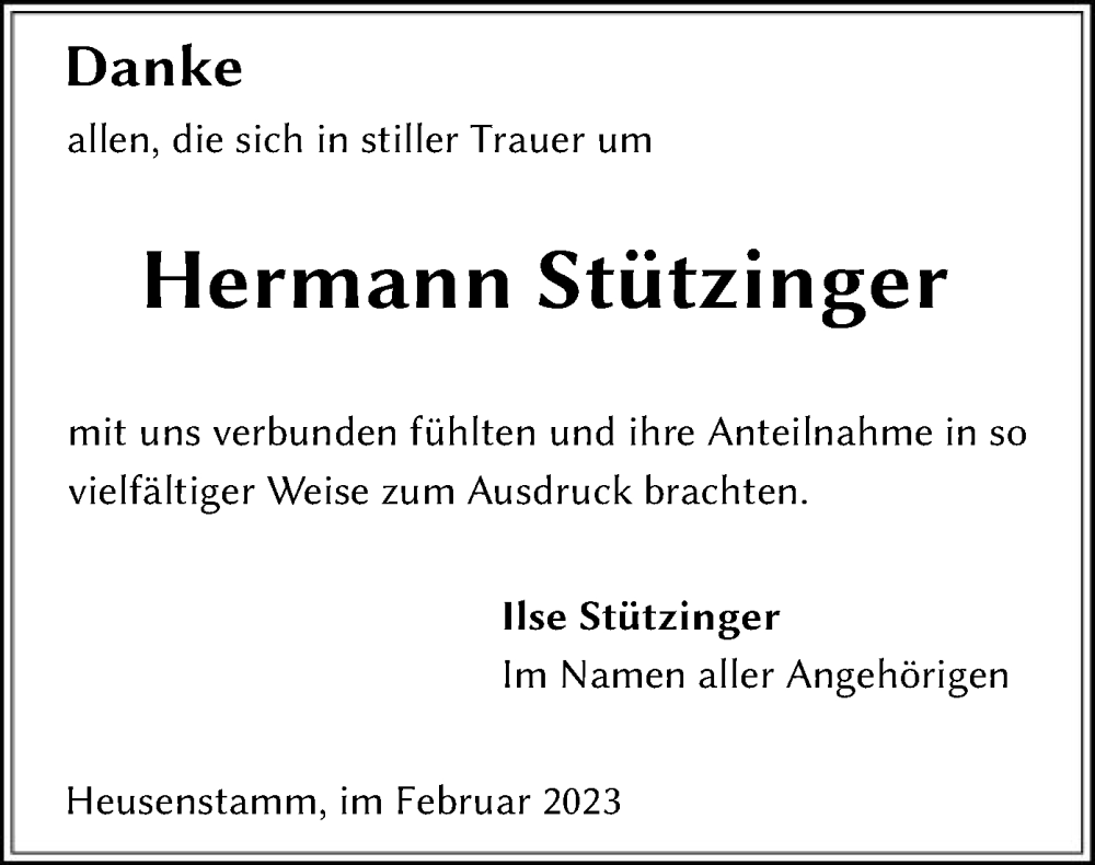 Hier finden Sie alle Traueranzeigen aus der Zeitung, die bisher für Hermann Stützinger erschienen sind. Weitere Traueranzeigen, die in der Zeitung erscheinen, werden hier ebenfalls aufgelistet