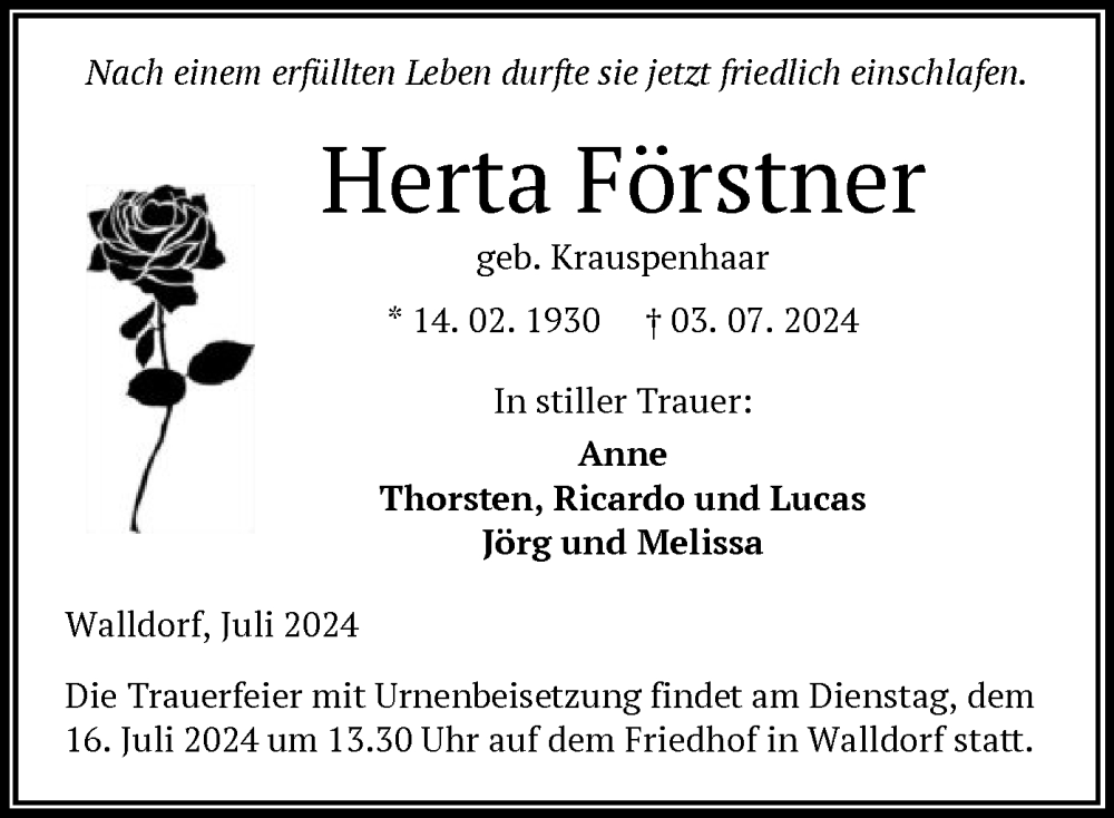 Hier finden Sie alle Traueranzeigen aus der Zeitung, die bisher für Herta Förstner erschienen sind. Weitere Traueranzeigen, die in der Zeitung erscheinen, werden hier ebenfalls aufgelistet