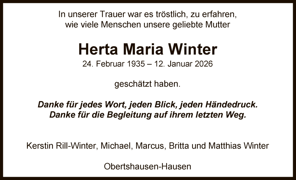 Hier finden Sie alle Traueranzeigen aus der Zeitung, die bisher für Herta Maria Winter erschienen sind. Weitere Traueranzeigen, die in der Zeitung erscheinen, werden hier ebenfalls aufgelistet