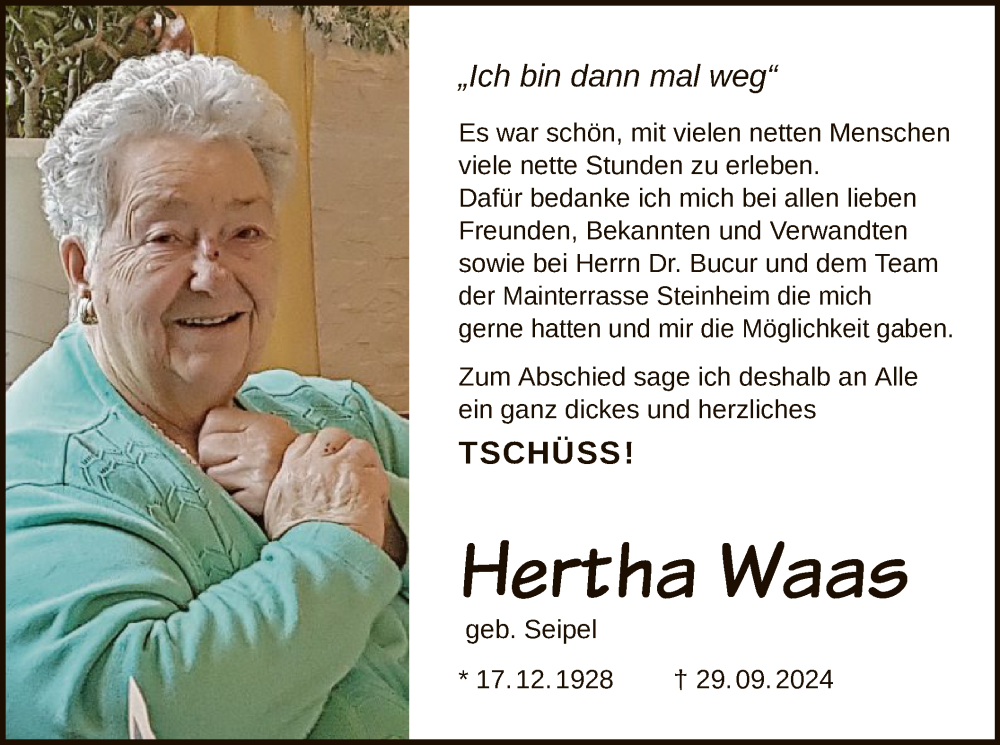 Hier finden Sie alle Traueranzeigen aus der Zeitung, die bisher für Hertha Waas erschienen sind. Weitere Traueranzeigen, die in der Zeitung erscheinen, werden hier ebenfalls aufgelistet