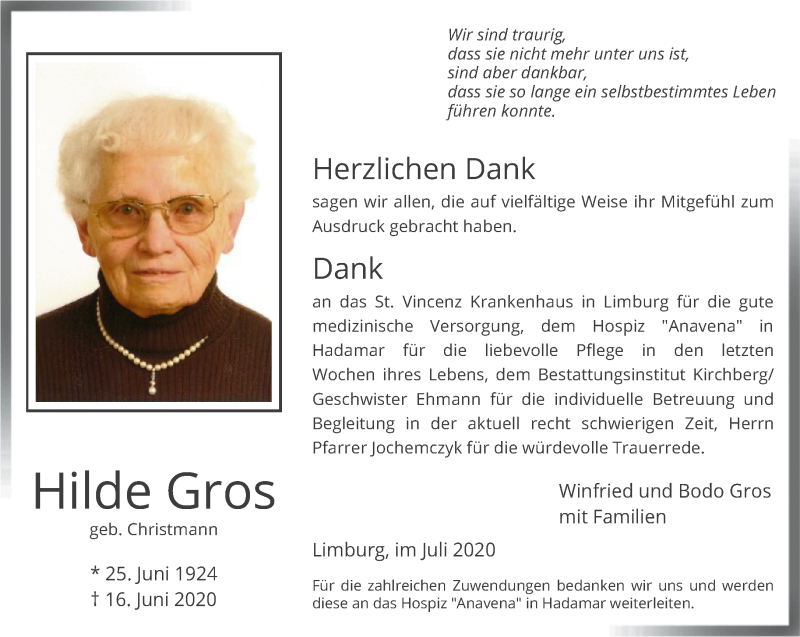 Hier finden Sie alle Traueranzeigen aus der Zeitung, die bisher für Hilde Gros erschienen sind. Weitere Traueranzeigen, die in der Zeitung erscheinen, werden hier ebenfalls aufgelistet