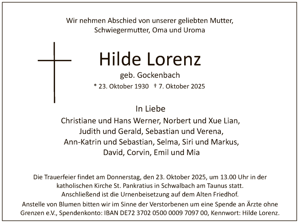Hier finden Sie alle Traueranzeigen aus der Zeitung, die bisher für Hilde Lorenz erschienen sind. Weitere Traueranzeigen, die in der Zeitung erscheinen, werden hier ebenfalls aufgelistet