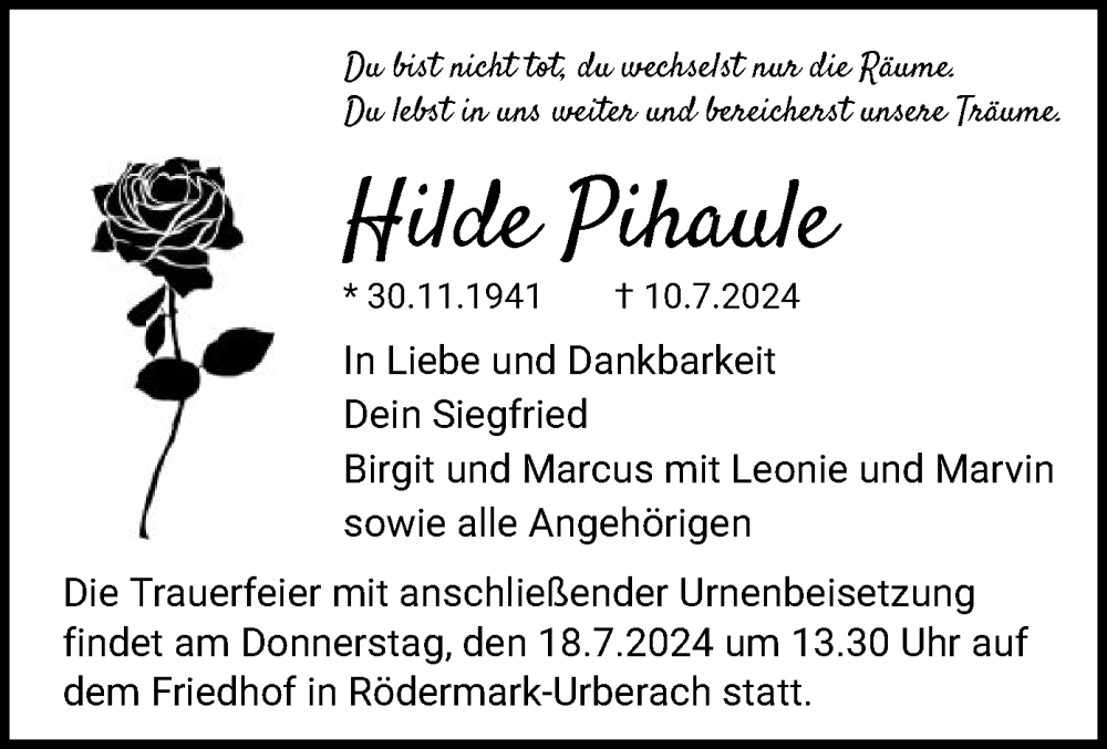 Hier finden Sie alle Traueranzeigen aus der Zeitung, die bisher für Hilde Pihaule erschienen sind. Weitere Traueranzeigen, die in der Zeitung erscheinen, werden hier ebenfalls aufgelistet