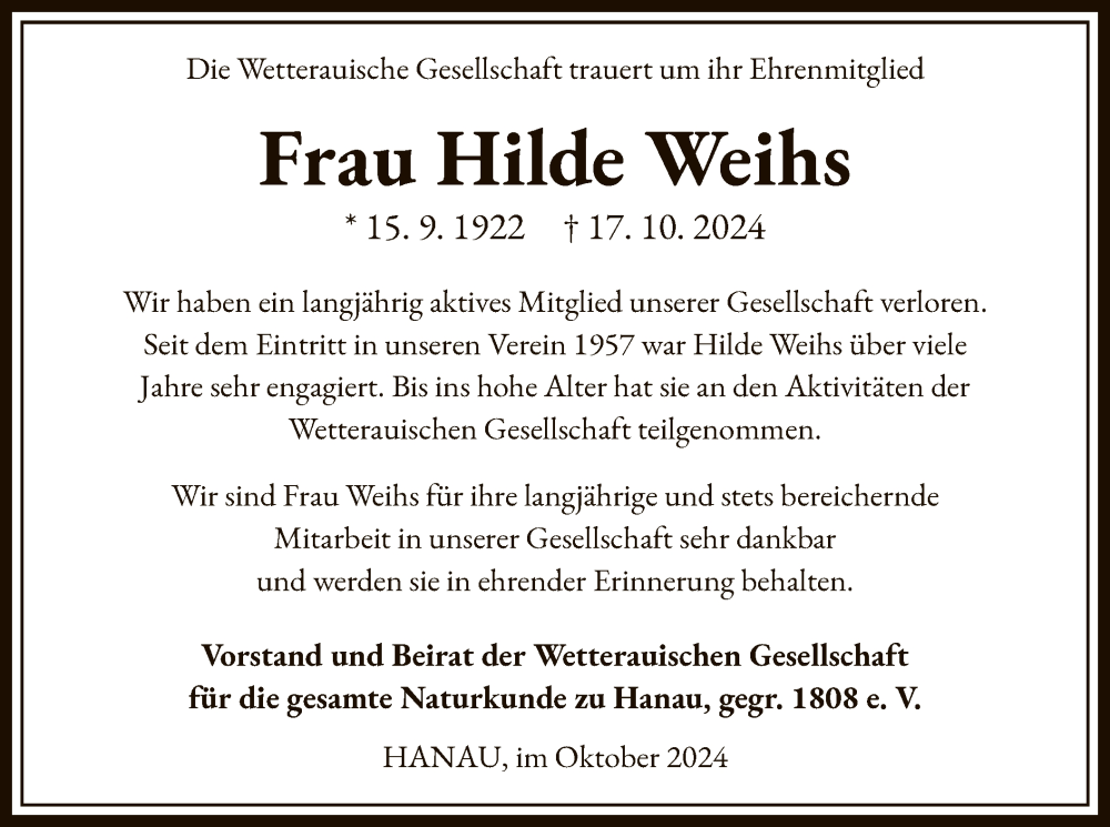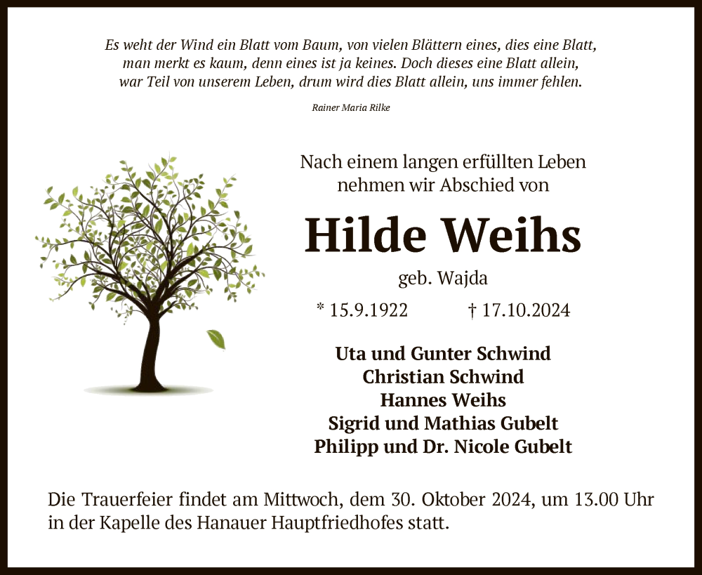 Hier finden Sie alle Traueranzeigen aus der Zeitung, die bisher für Hilde Weihs erschienen sind. Weitere Traueranzeigen, die in der Zeitung erscheinen, werden hier ebenfalls aufgelistet