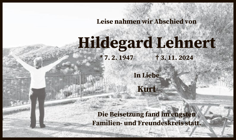 Hier finden Sie alle Traueranzeigen aus der Zeitung, die bisher für Hildegard Lehnert erschienen sind. Weitere Traueranzeigen, die in der Zeitung erscheinen, werden hier ebenfalls aufgelistet