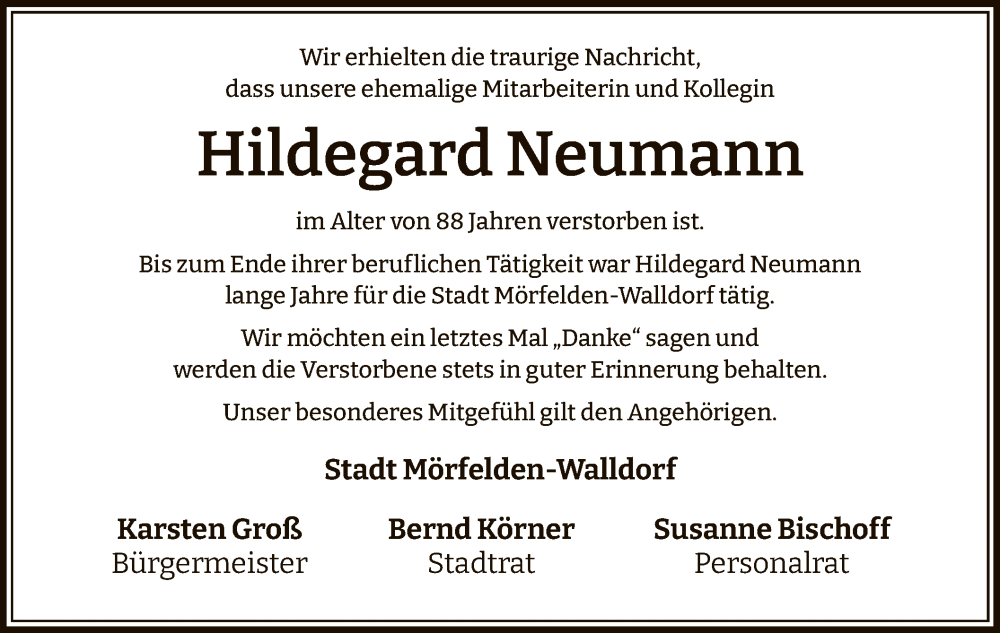 Hier finden Sie alle Traueranzeigen aus der Zeitung, die bisher für Hildegard Neumann erschienen sind. Weitere Traueranzeigen, die in der Zeitung erscheinen, werden hier ebenfalls aufgelistet