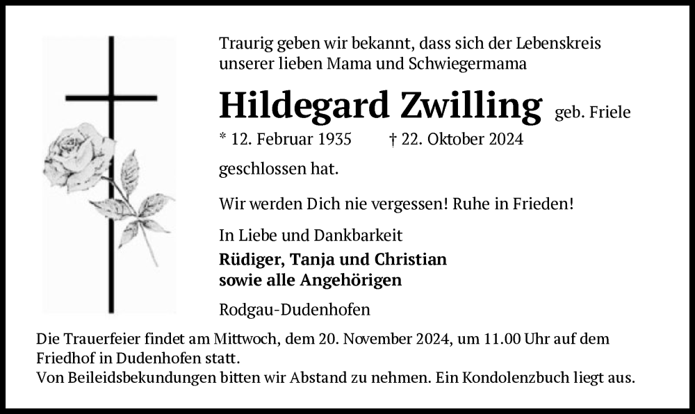 Hier finden Sie alle Traueranzeigen aus der Zeitung, die bisher für Hildegard Zwilling erschienen sind. Weitere Traueranzeigen, die in der Zeitung erscheinen, werden hier ebenfalls aufgelistet