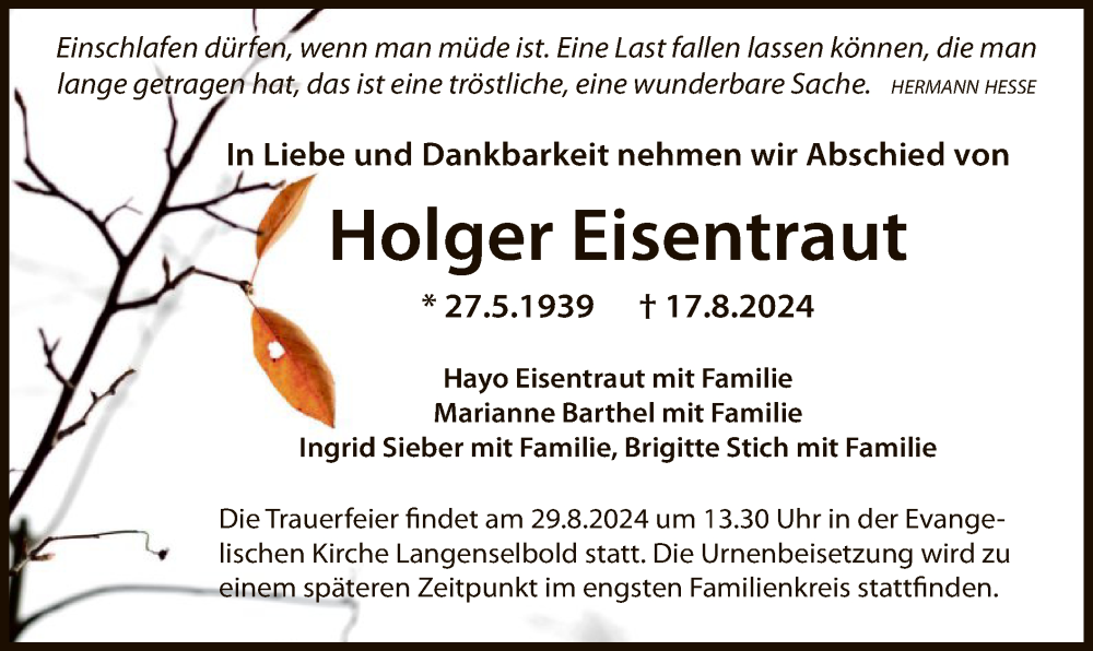 Hier finden Sie alle Traueranzeigen aus der Zeitung, die bisher für Holger Eisentraut erschienen sind. Weitere Traueranzeigen, die in der Zeitung erscheinen, werden hier ebenfalls aufgelistet