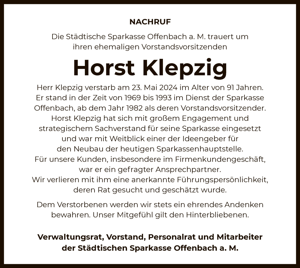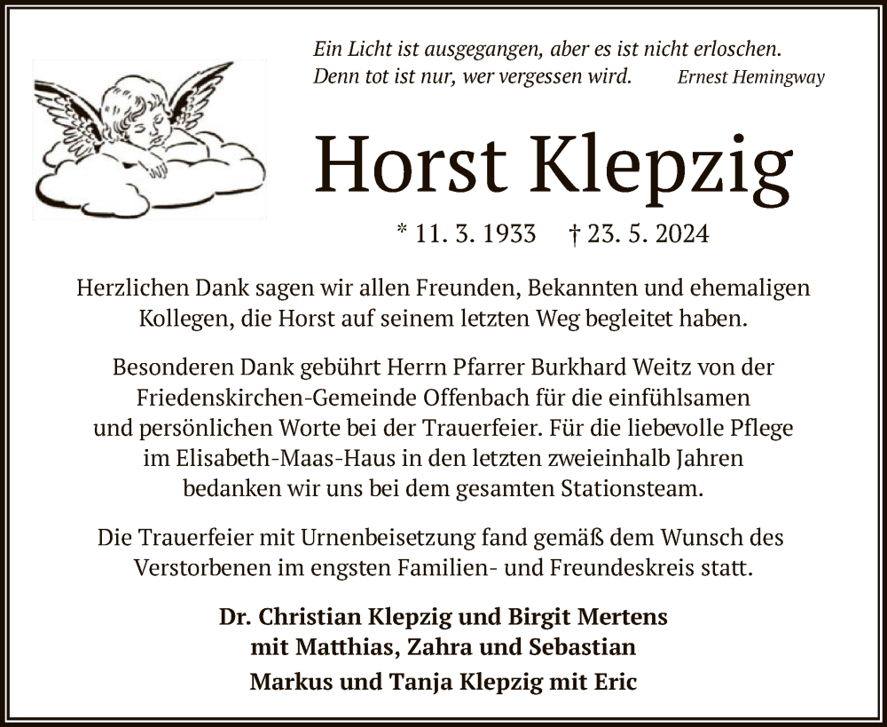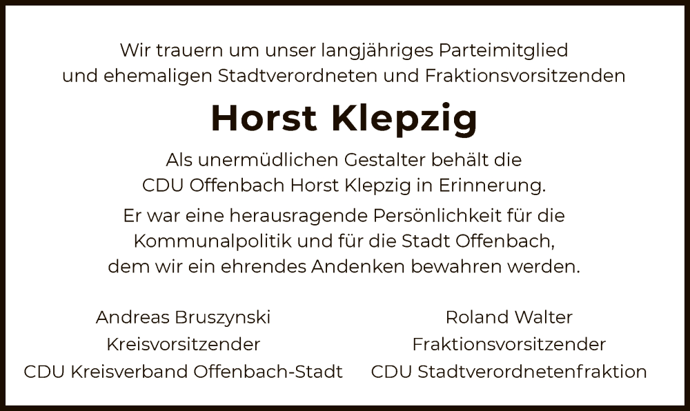 Hier finden Sie alle Traueranzeigen aus der Zeitung, die bisher für Horst Klepzig erschienen sind. Weitere Traueranzeigen, die in der Zeitung erscheinen, werden hier ebenfalls aufgelistet