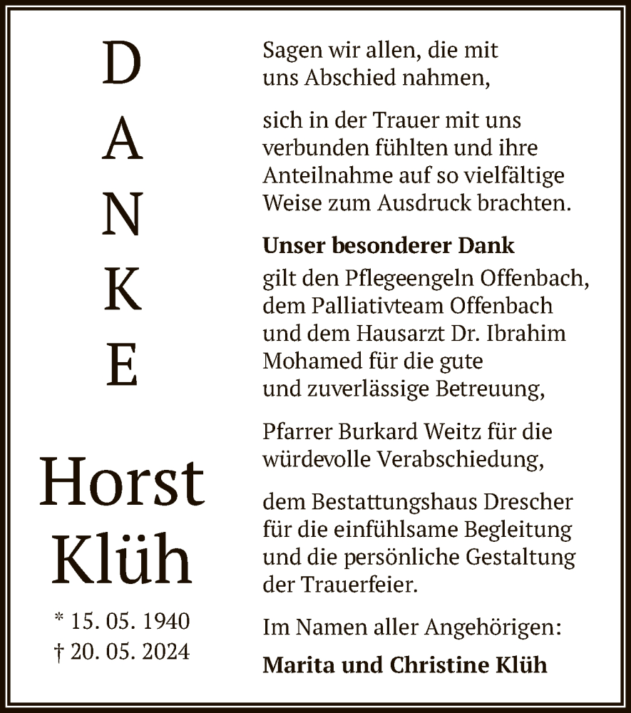 Hier finden Sie alle Traueranzeigen aus der Zeitung, die bisher für Horst Klüh erschienen sind. Weitere Traueranzeigen, die in der Zeitung erscheinen, werden hier ebenfalls aufgelistet