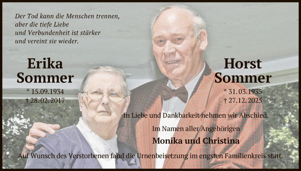 Hier finden Sie alle Traueranzeigen aus der Zeitung, die bisher für Horst Sommer erschienen sind. Weitere Traueranzeigen, die in der Zeitung erscheinen, werden hier ebenfalls aufgelistet