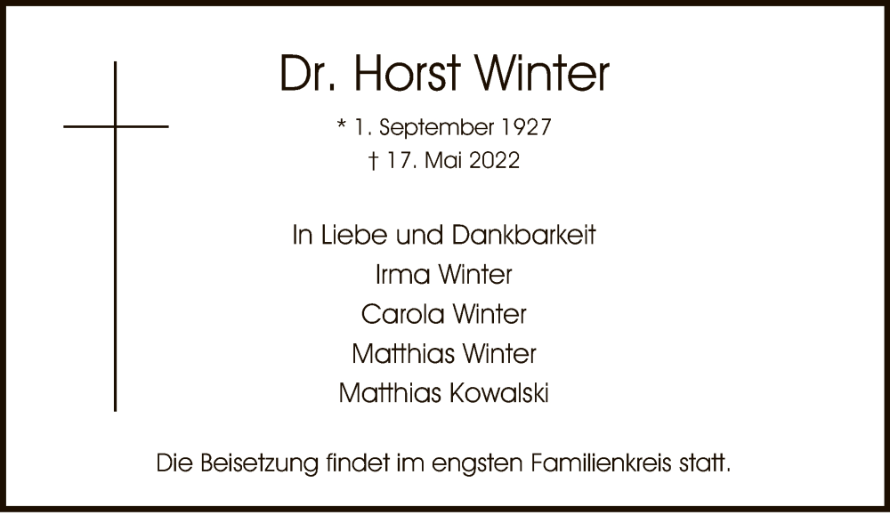 Hier finden Sie alle Traueranzeigen aus der Zeitung, die bisher für Horst Winter erschienen sind. Weitere Traueranzeigen, die in der Zeitung erscheinen, werden hier ebenfalls aufgelistet