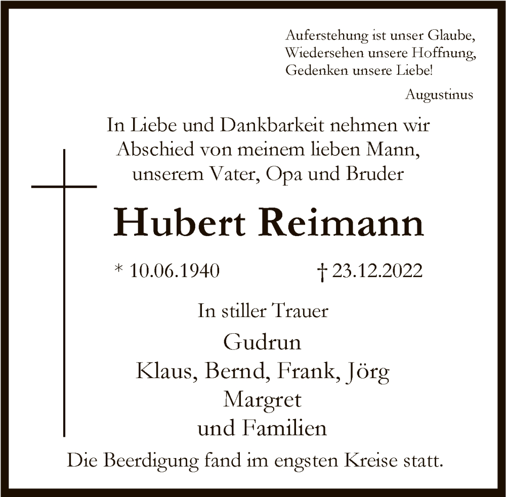 Hier finden Sie alle Traueranzeigen aus der Zeitung, die bisher für Hubert Reimann erschienen sind. Weitere Traueranzeigen, die in der Zeitung erscheinen, werden hier ebenfalls aufgelistet