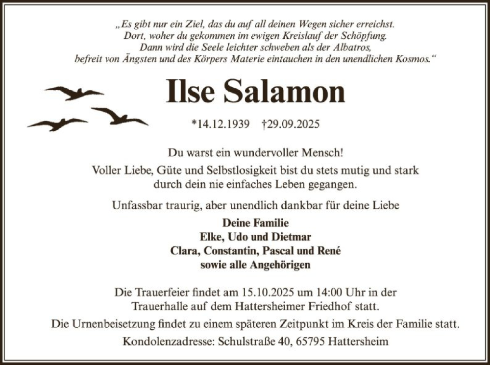 Hier finden Sie alle Traueranzeigen aus der Zeitung, die bisher für Ilse Salamon erschienen sind. Weitere Traueranzeigen, die in der Zeitung erscheinen, werden hier ebenfalls aufgelistet