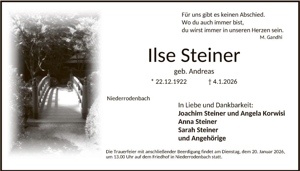 Hier finden Sie alle Traueranzeigen aus der Zeitung, die bisher für Ilse Steiner erschienen sind. Weitere Traueranzeigen, die in der Zeitung erscheinen, werden hier ebenfalls aufgelistet