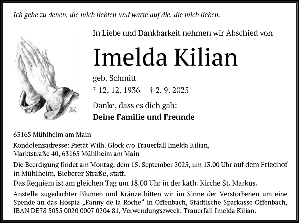 Hier finden Sie alle Traueranzeigen aus der Zeitung, die bisher für Imelda Kilian erschienen sind. Weitere Traueranzeigen, die in der Zeitung erscheinen, werden hier ebenfalls aufgelistet