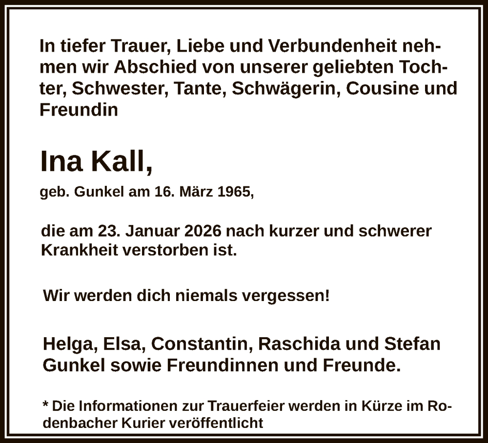 Hier finden Sie alle Traueranzeigen aus der Zeitung, die bisher für Ina Kall erschienen sind. Weitere Traueranzeigen, die in der Zeitung erscheinen, werden hier ebenfalls aufgelistet
