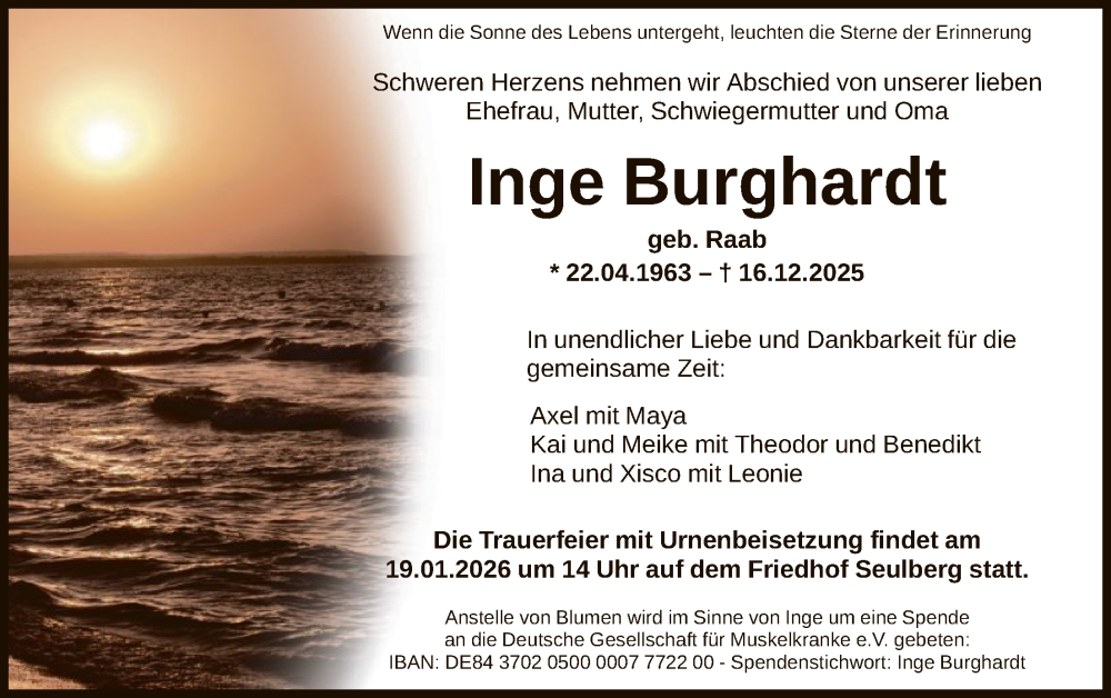 Hier finden Sie alle Traueranzeigen aus der Zeitung, die bisher für Inge Burghardt erschienen sind. Weitere Traueranzeigen, die in der Zeitung erscheinen, werden hier ebenfalls aufgelistet