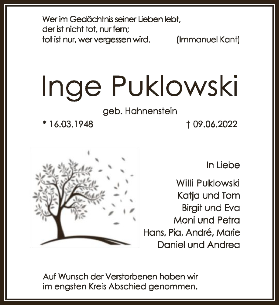 Hier finden Sie alle Traueranzeigen aus der Zeitung, die bisher für Inge Puklowski erschienen sind. Weitere Traueranzeigen, die in der Zeitung erscheinen, werden hier ebenfalls aufgelistet