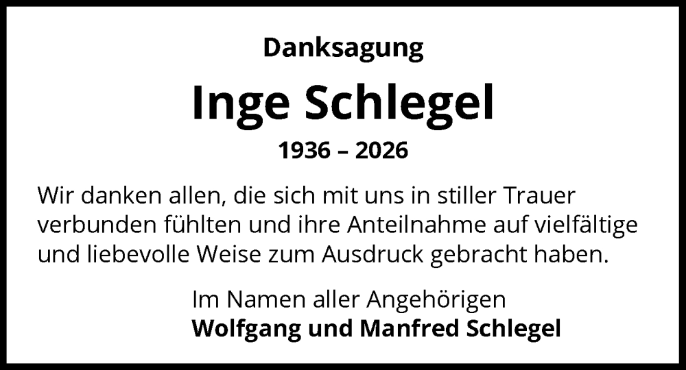 Hier finden Sie alle Traueranzeigen aus der Zeitung, die bisher für Inge Schlegel erschienen sind. Weitere Traueranzeigen, die in der Zeitung erscheinen, werden hier ebenfalls aufgelistet