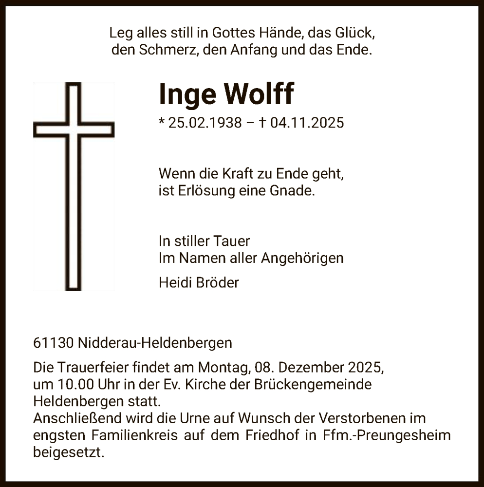 Hier finden Sie alle Traueranzeigen aus der Zeitung, die bisher für Inge Wolff erschienen sind. Weitere Traueranzeigen, die in der Zeitung erscheinen, werden hier ebenfalls aufgelistet