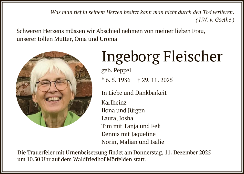 Hier finden Sie alle Traueranzeigen aus der Zeitung, die bisher für Ingeborg Fleischer erschienen sind. Weitere Traueranzeigen, die in der Zeitung erscheinen, werden hier ebenfalls aufgelistet