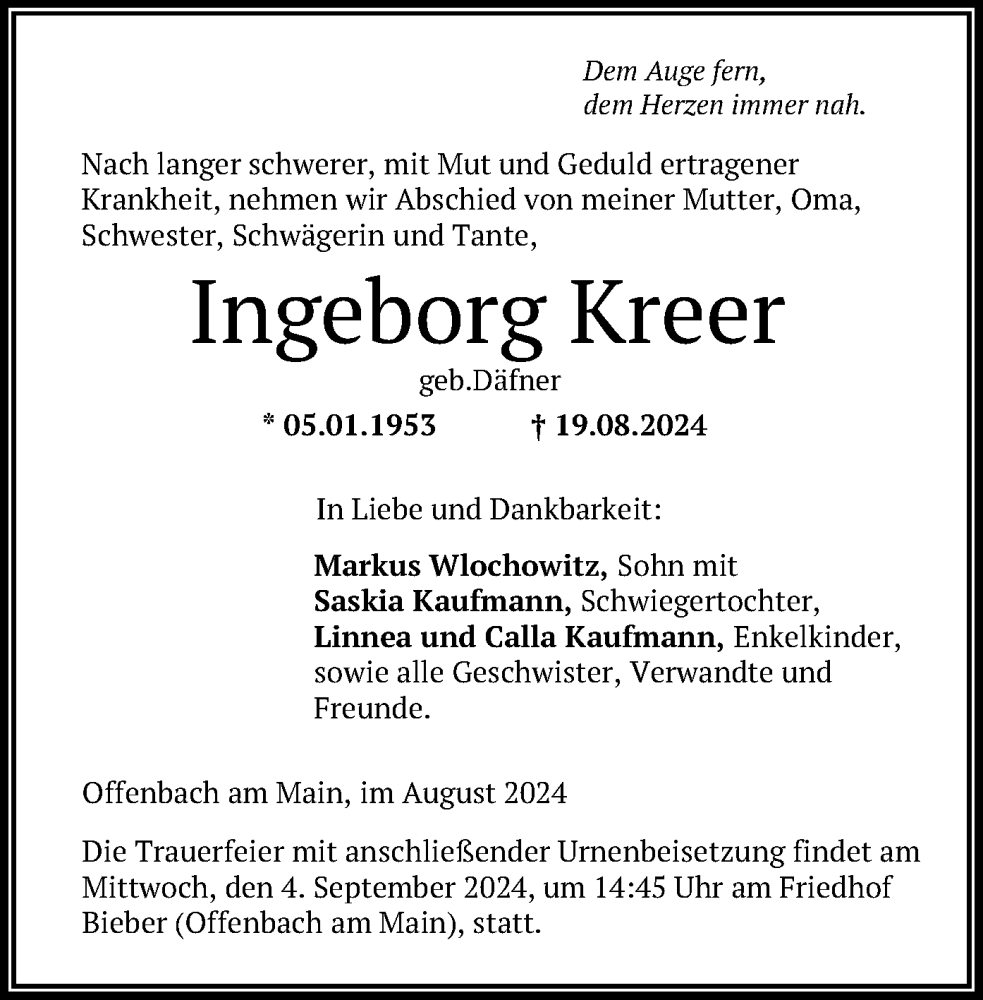 Hier finden Sie alle Traueranzeigen aus der Zeitung, die bisher für Ingeborg Kreer erschienen sind. Weitere Traueranzeigen, die in der Zeitung erscheinen, werden hier ebenfalls aufgelistet