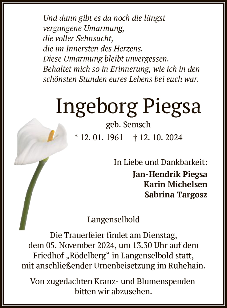 Hier finden Sie alle Traueranzeigen aus der Zeitung, die bisher für Ingeborg Piegsa erschienen sind. Weitere Traueranzeigen, die in der Zeitung erscheinen, werden hier ebenfalls aufgelistet