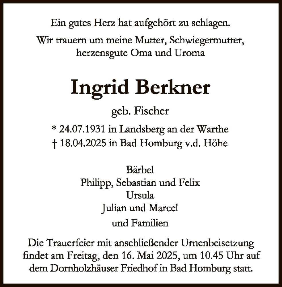 Hier finden Sie alle Traueranzeigen aus der Zeitung, die bisher für Ingrid Berkner erschienen sind. Weitere Traueranzeigen, die in der Zeitung erscheinen, werden hier ebenfalls aufgelistet