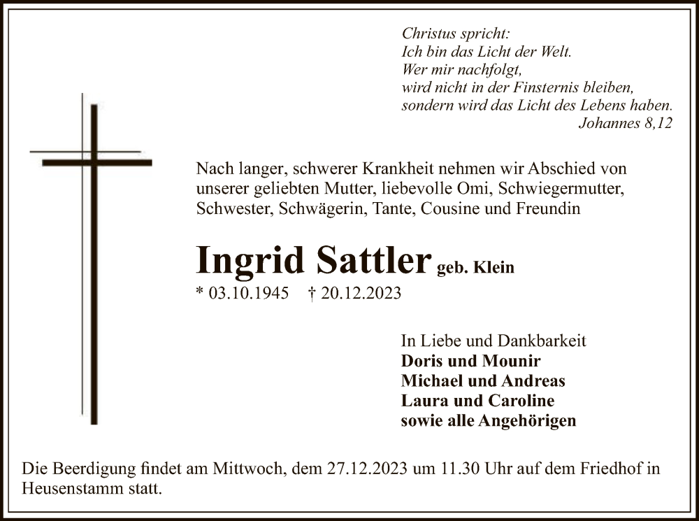 Hier finden Sie alle Traueranzeigen aus der Zeitung, die bisher für Ingrid Sattler erschienen sind. Weitere Traueranzeigen, die in der Zeitung erscheinen, werden hier ebenfalls aufgelistet
