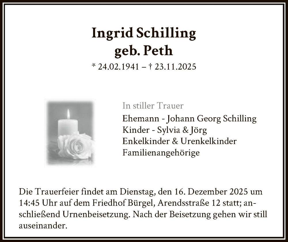 Hier finden Sie alle Traueranzeigen aus der Zeitung, die bisher für Ingrid Schilling erschienen sind. Weitere Traueranzeigen, die in der Zeitung erscheinen, werden hier ebenfalls aufgelistet