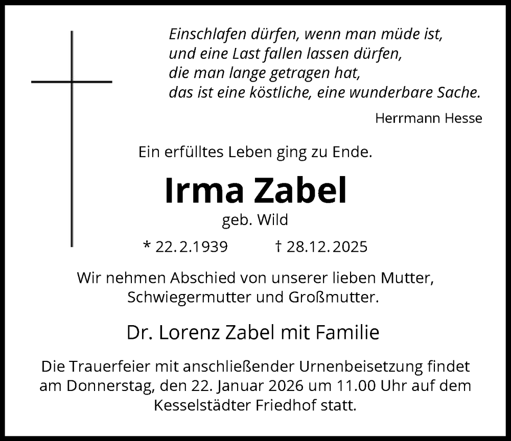 Hier finden Sie alle Traueranzeigen aus der Zeitung, die bisher für Irma Zabel erschienen sind. Weitere Traueranzeigen, die in der Zeitung erscheinen, werden hier ebenfalls aufgelistet