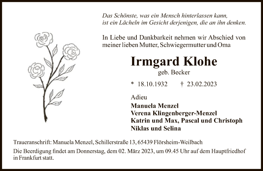 Hier finden Sie alle Traueranzeigen aus der Zeitung, die bisher für Irmgard Klohe erschienen sind. Weitere Traueranzeigen, die in der Zeitung erscheinen, werden hier ebenfalls aufgelistet