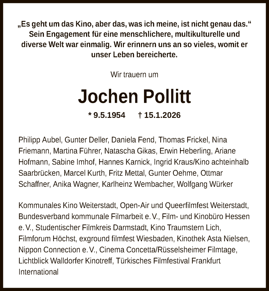 Hier finden Sie alle Traueranzeigen aus der Zeitung, die bisher für Jochen Pollitt erschienen sind. Weitere Traueranzeigen, die in der Zeitung erscheinen, werden hier ebenfalls aufgelistet