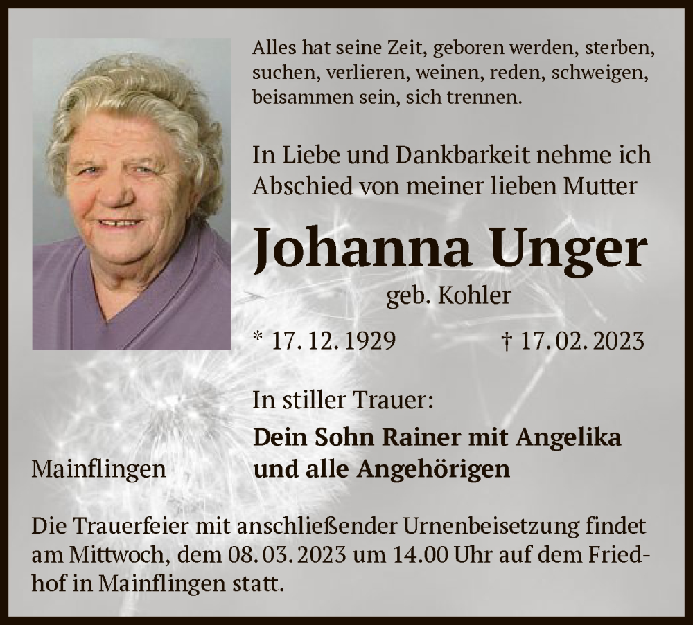 Hier finden Sie alle Traueranzeigen aus der Zeitung, die bisher für Johanna Unger erschienen sind. Weitere Traueranzeigen, die in der Zeitung erscheinen, werden hier ebenfalls aufgelistet