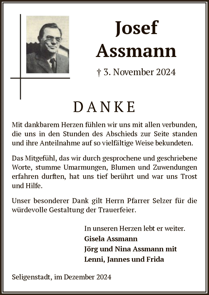 Hier finden Sie alle Traueranzeigen aus der Zeitung, die bisher für Josef Assmann erschienen sind. Weitere Traueranzeigen, die in der Zeitung erscheinen, werden hier ebenfalls aufgelistet