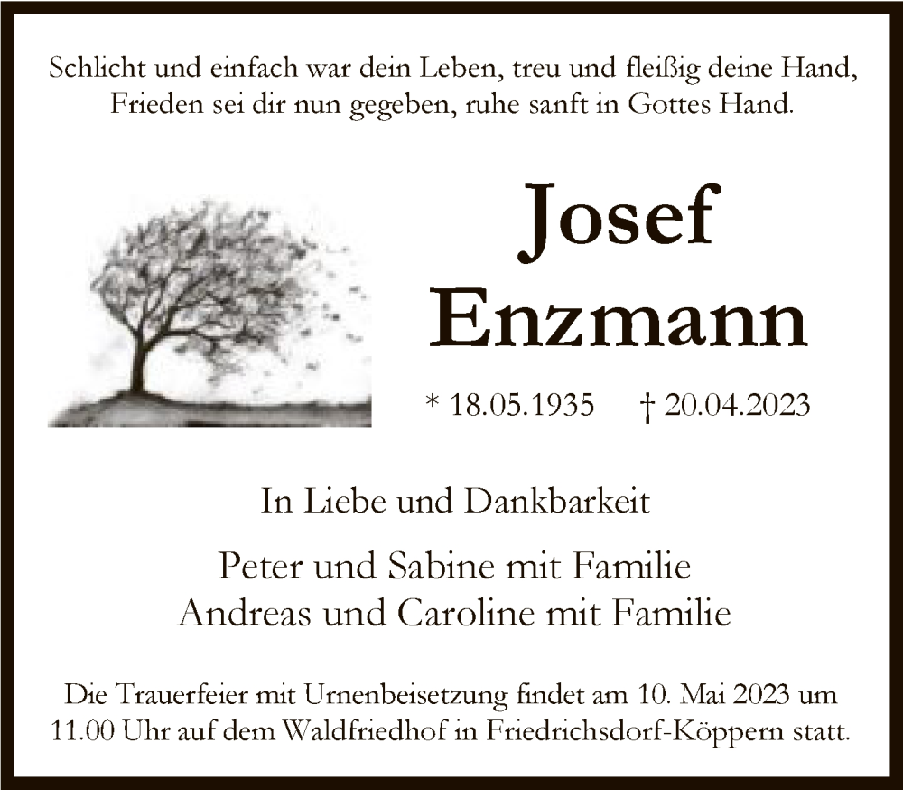 Hier finden Sie alle Traueranzeigen aus der Zeitung, die bisher für Josef Enzmann erschienen sind. Weitere Traueranzeigen, die in der Zeitung erscheinen, werden hier ebenfalls aufgelistet