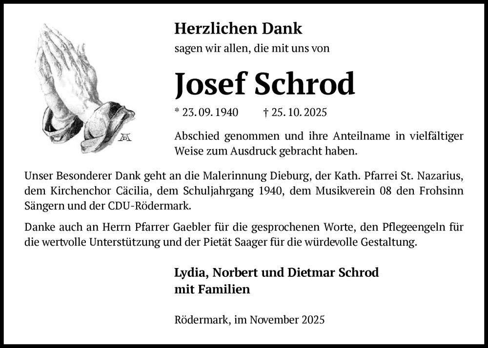 Hier finden Sie alle Traueranzeigen aus der Zeitung, die bisher für Josef Schrod erschienen sind. Weitere Traueranzeigen, die in der Zeitung erscheinen, werden hier ebenfalls aufgelistet