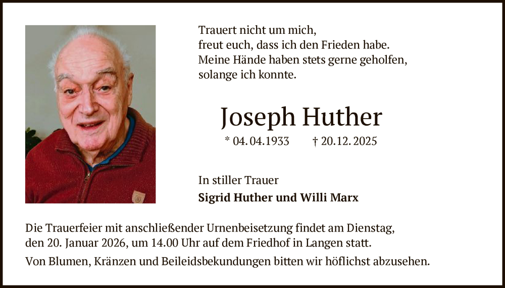 Hier finden Sie alle Traueranzeigen aus der Zeitung, die bisher für Joseph Huther erschienen sind. Weitere Traueranzeigen, die in der Zeitung erscheinen, werden hier ebenfalls aufgelistet