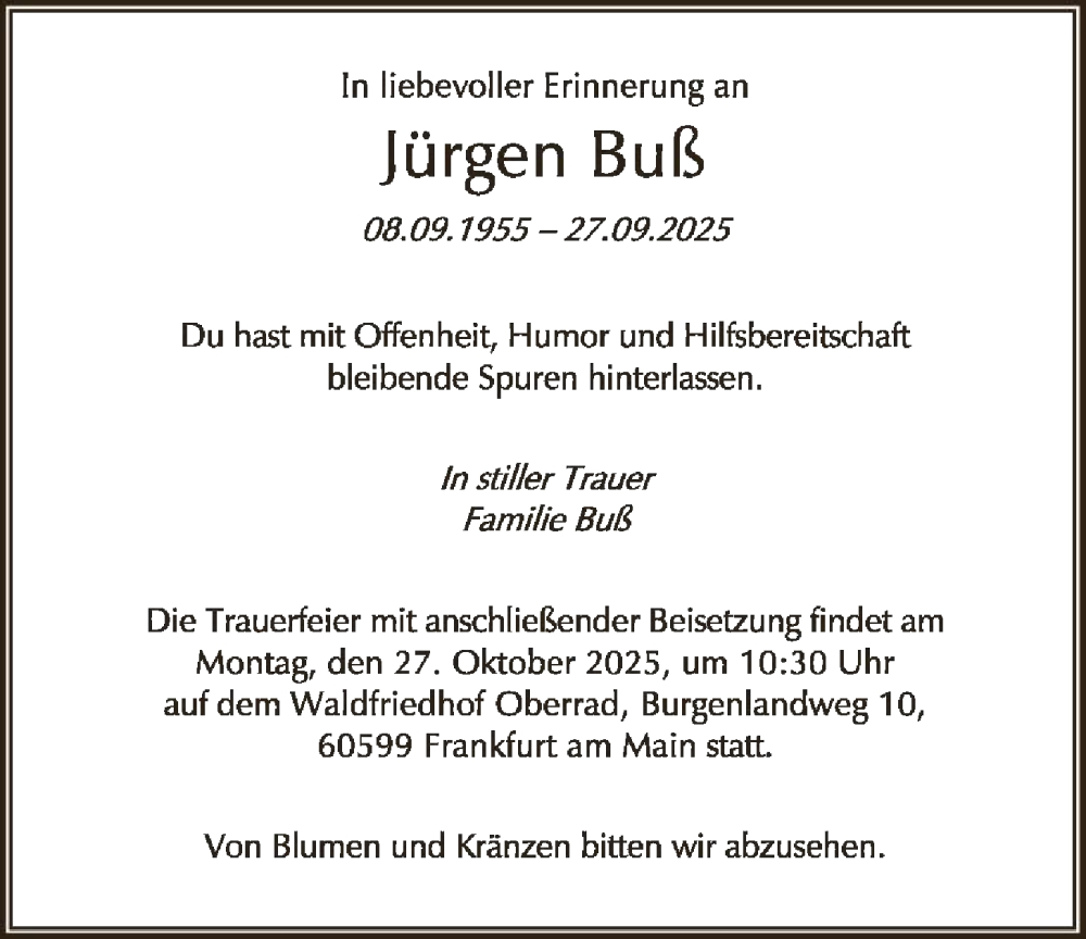 Hier finden Sie alle Traueranzeigen aus der Zeitung, die bisher für Jürgen Buß erschienen sind. Weitere Traueranzeigen, die in der Zeitung erscheinen, werden hier ebenfalls aufgelistet