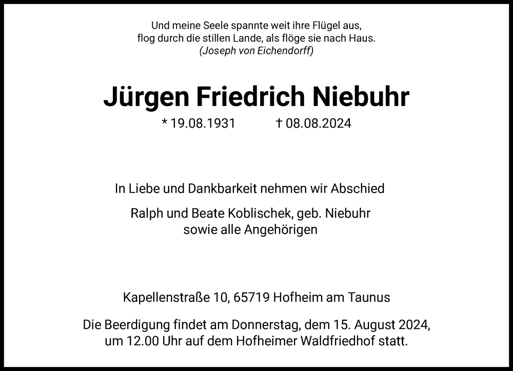 Hier finden Sie alle Traueranzeigen aus der Zeitung, die bisher für Jürgen Friedrich Niebuhr erschienen sind. Weitere Traueranzeigen, die in der Zeitung erscheinen, werden hier ebenfalls aufgelistet