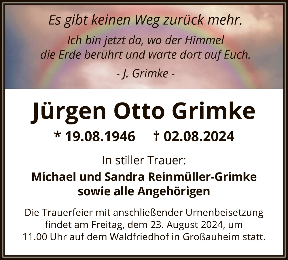 Hier finden Sie alle Traueranzeigen aus der Zeitung, die bisher für Jürgen Otto Grimke erschienen sind. Weitere Traueranzeigen, die in der Zeitung erscheinen, werden hier ebenfalls aufgelistet