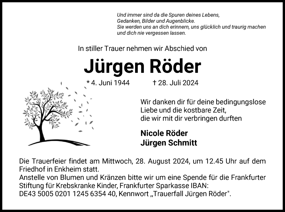 Hier finden Sie alle Traueranzeigen aus der Zeitung, die bisher für Jürgen Röder erschienen sind. Weitere Traueranzeigen, die in der Zeitung erscheinen, werden hier ebenfalls aufgelistet