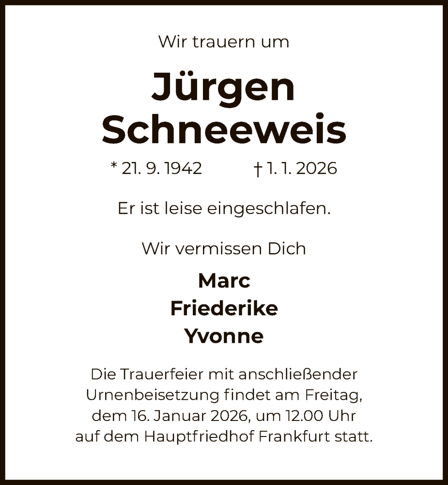 Hier finden Sie alle Traueranzeigen aus der Zeitung, die bisher für Jürgen Schneeweis erschienen sind. Weitere Traueranzeigen, die in der Zeitung erscheinen, werden hier ebenfalls aufgelistet