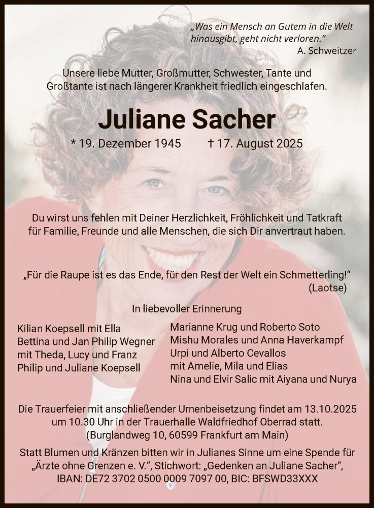 Hier finden Sie alle Traueranzeigen aus der Zeitung, die bisher für Juliane Sacher erschienen sind. Weitere Traueranzeigen, die in der Zeitung erscheinen, werden hier ebenfalls aufgelistet