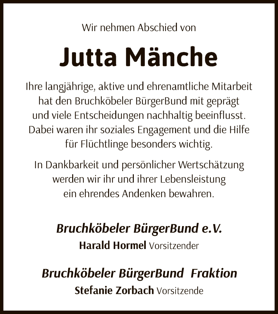 Hier finden Sie alle Traueranzeigen aus der Zeitung, die bisher für Jutta Mänche erschienen sind. Weitere Traueranzeigen, die in der Zeitung erscheinen, werden hier ebenfalls aufgelistet