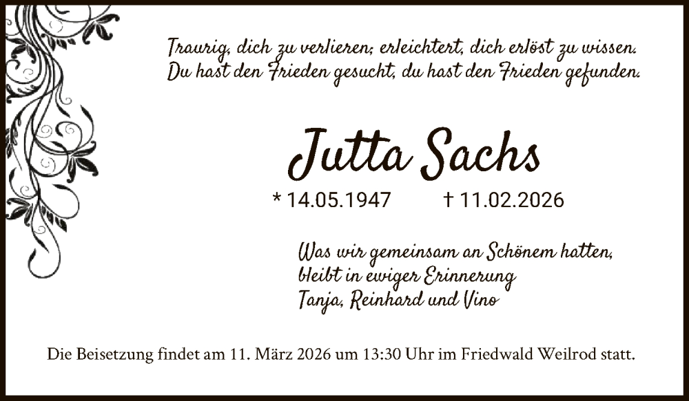 Hier finden Sie alle Traueranzeigen aus der Zeitung, die bisher für Jutta Sachs erschienen sind. Weitere Traueranzeigen, die in der Zeitung erscheinen, werden hier ebenfalls aufgelistet