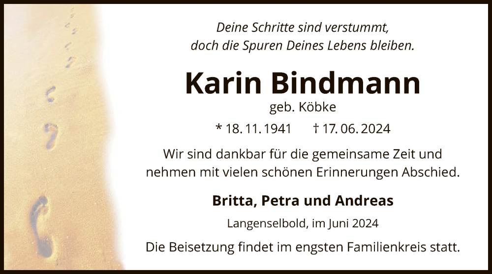 Hier finden Sie alle Traueranzeigen aus der Zeitung, die bisher für Karin Bindmann erschienen sind. Weitere Traueranzeigen, die in der Zeitung erscheinen, werden hier ebenfalls aufgelistet