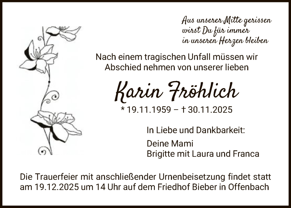 Hier finden Sie alle Traueranzeigen aus der Zeitung, die bisher für Karin Fröhlich erschienen sind. Weitere Traueranzeigen, die in der Zeitung erscheinen, werden hier ebenfalls aufgelistet