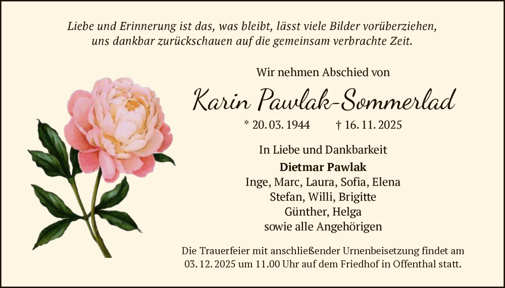Hier finden Sie alle Traueranzeigen aus der Zeitung, die bisher für Karin Pawlak erschienen sind. Weitere Traueranzeigen, die in der Zeitung erscheinen, werden hier ebenfalls aufgelistet